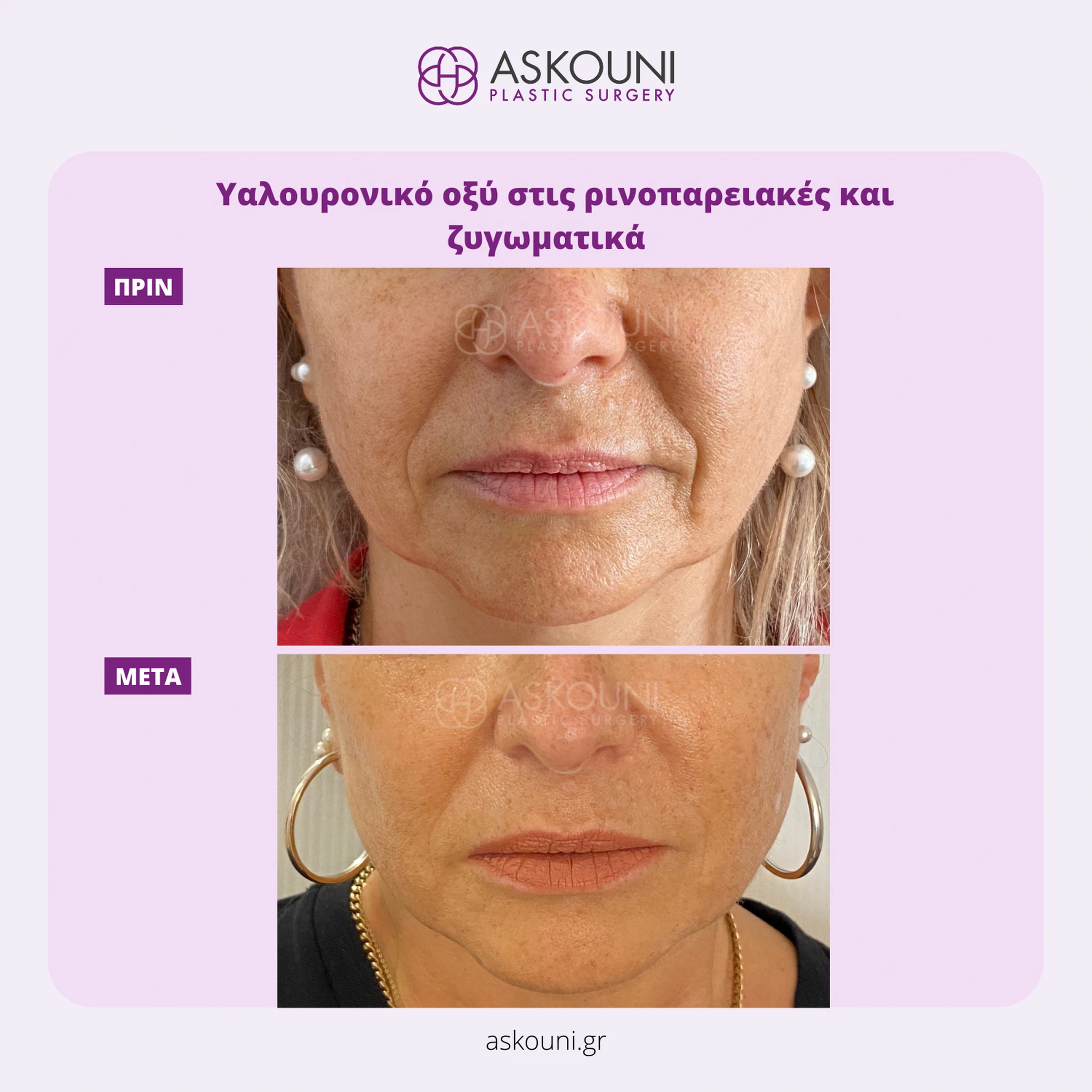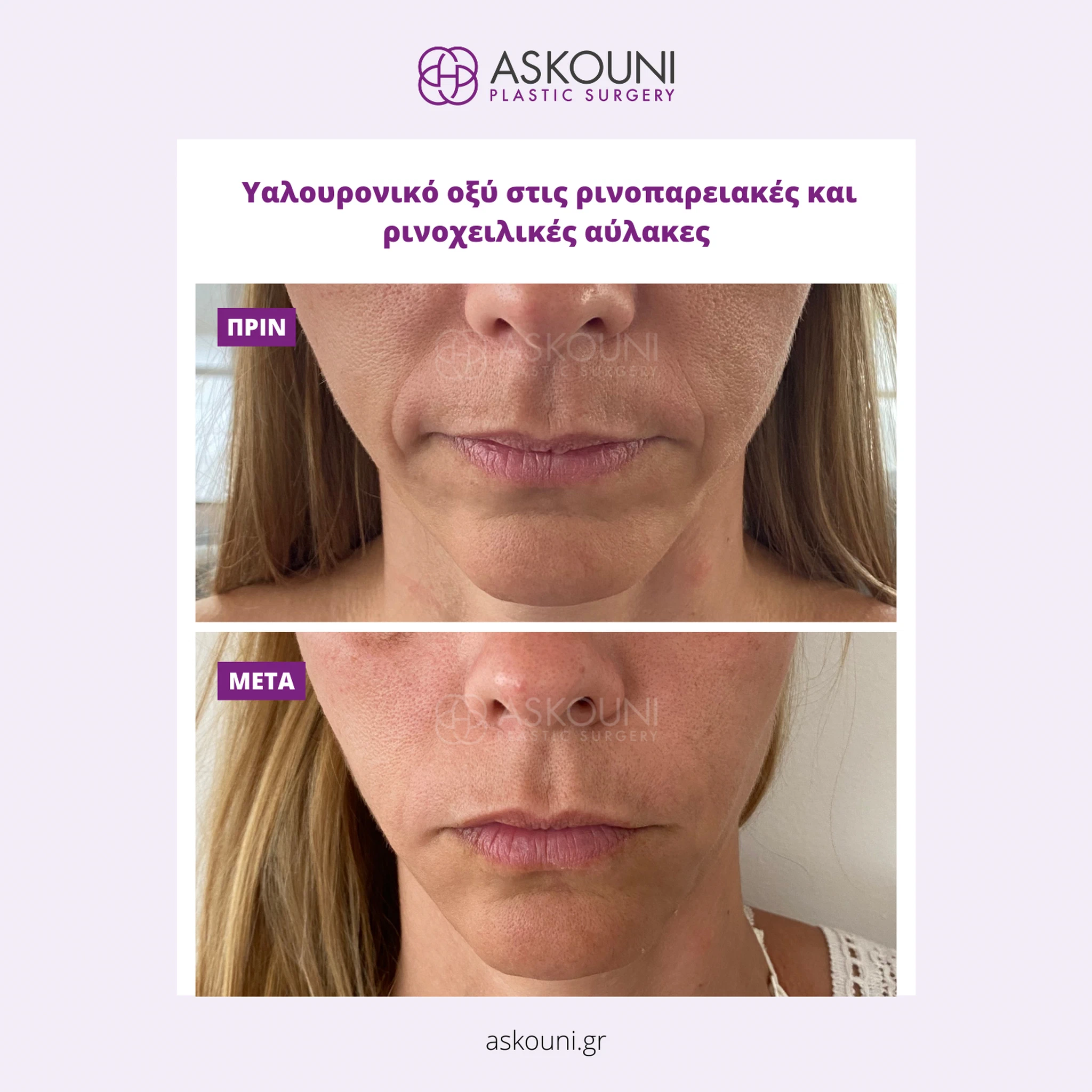 - Ρινοπαρειακές αύλακες και ρυτίδες μαριονέτας: Εξομάλυνση βαθιών πτυχώσεων που εμφανίζονται με τη γήρανση και την κίνηση του προσώπου.